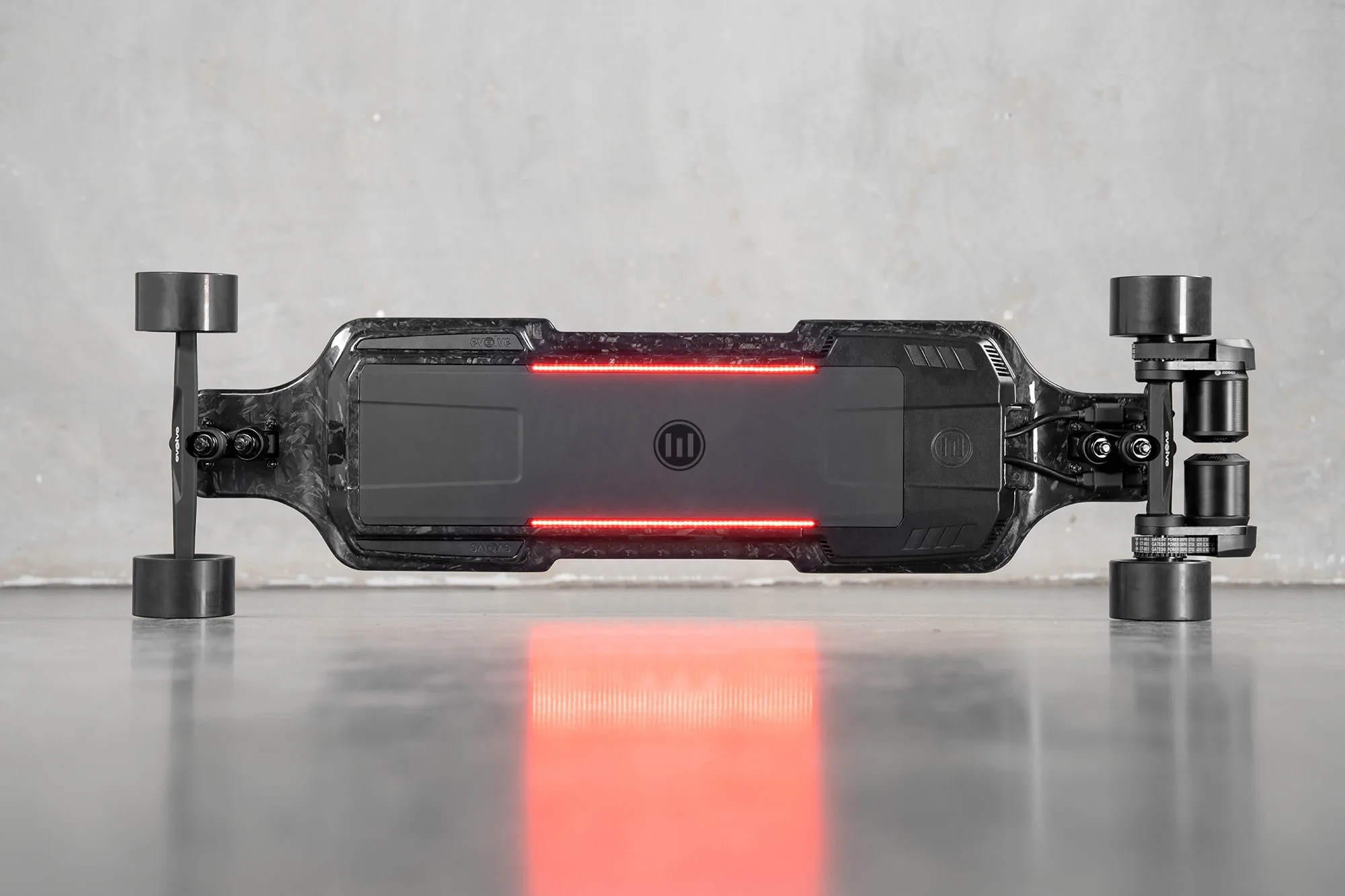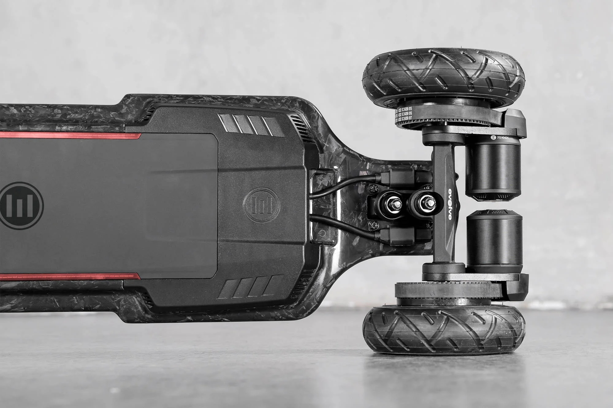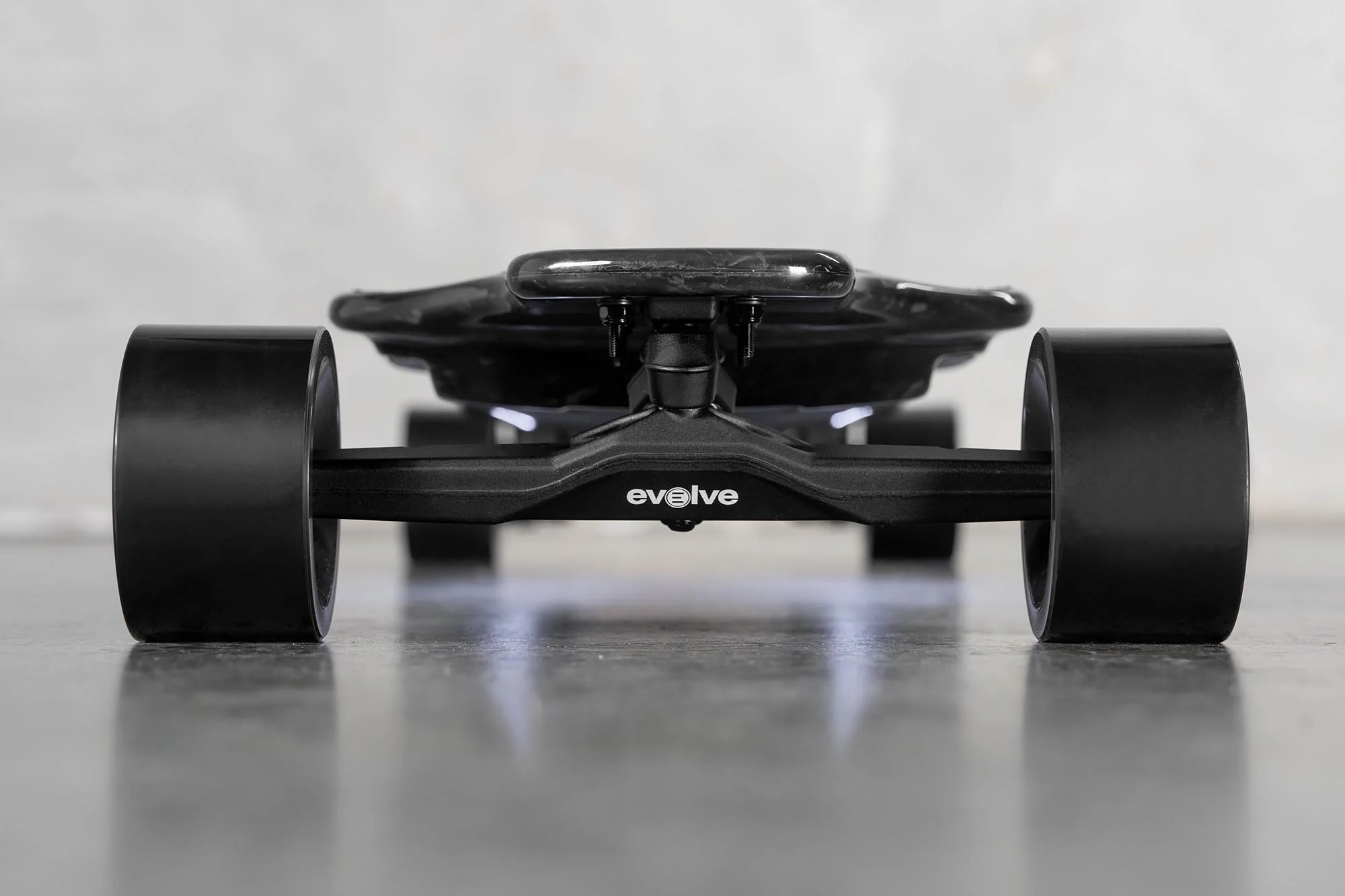 Het deck van de Diablo Carbon, vervaardigd uit koolstofvezel, toont het innovatieve ontwerp van Evolve, dat robuustheid combineert met perfecte flexibiliteit voor extreme riders.